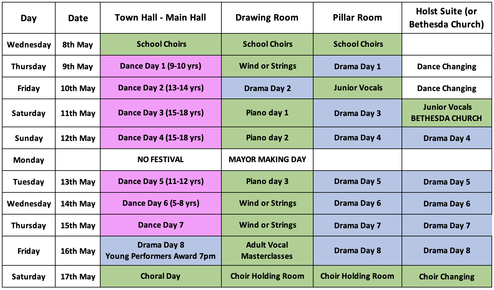 Entry fees for each class are shown in the Syllabus. Spectators should note that the class entry fee is for the performer only. Tickets for admission for those who wish to watch performances are £5 and will be available from the Town Hall Box Office beforehand and at any time during the Festival.